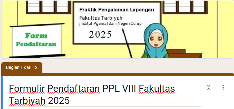 Fakultas Tarbiyah Institut Agama Islam Negeri (IAIN) Curup kembali menyelenggarakan program unggulannya, yaitu Praktik Pengalaman Lapangan (PPL) ke-VIII Tahun 2025. Pendaftaran resmi dibuka mulai tanggal 04 hingga 28 Agustus 2025, dan ditujukan bagi mahasiswa aktif Program Studi di bawah naungan Jurusan Tarbiyah yang telah memenuhi syarat akademik dan administratif.